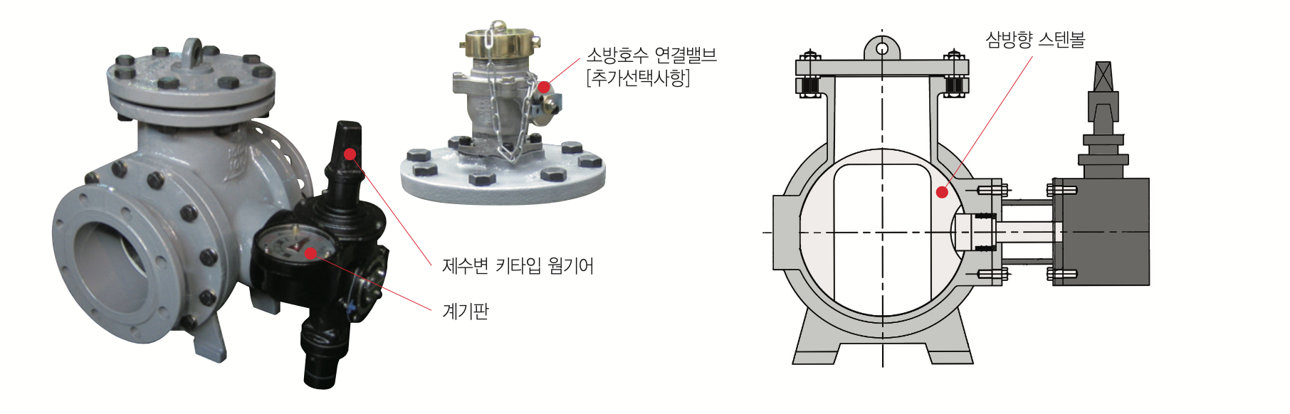 | · | 내부에 삼방향 스텐볼이 좌측·우측 90도 회전하면서 물 차단 (제수밸브 역할 수행) |